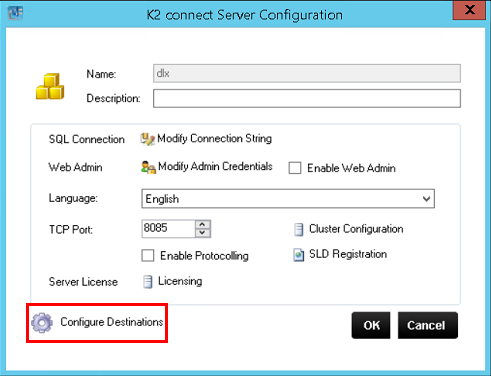 The Destination created in one K2 connect Server can be shared and made available to other K2 connect Server instances on the network. If a Clustered environment is configured, then the Destination must be shared. For more information on how to use a shared Destination, see the Distributed Configuration section in the Post Installation Configuration Steps topic.