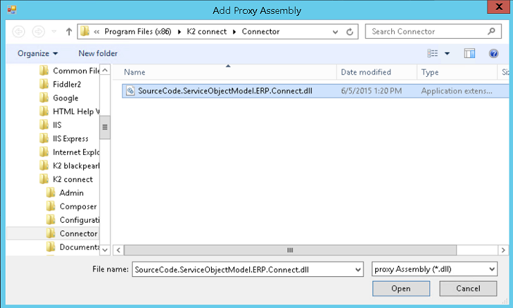 - The browser will open the correct location by default to select the SourceCode.ServiceObjectModel.ERP.Connect.dll.