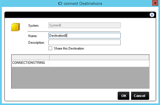 - Type a name and description for the Destination. Do not enable the Share this Destination option in a standalone environment. You can however enable this option if the configuration is done in a cluster environment on the first K2 connect Server. The Destination can then be imported from other K2 connect Servers as described in step 9 above.