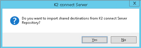 If this is done on a second K2 connect Server, click Yes to import a shared destination created on the first K2 connect Server.