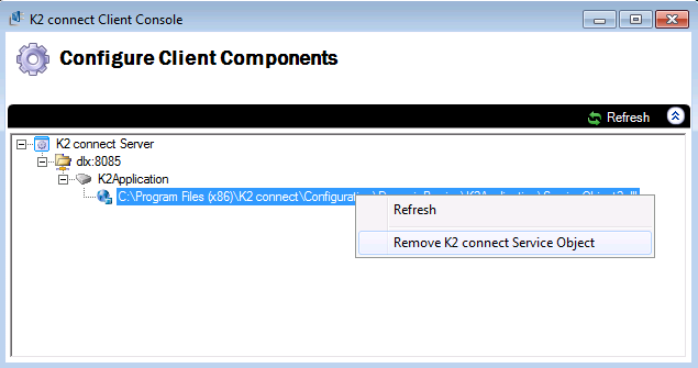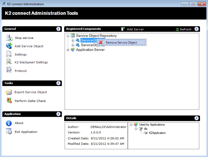 Service Objects may need to be removed from the K2 connect Server if for example they are not longer required for use in a project. You can achieve this using the Administration Tools or the Client Console.