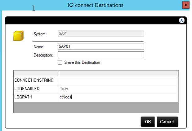 - Type a name and description for the Destination. Do not enable the Share this Destination option in a standalone environment. You can however enable this option if the configuration is done in a cluster environment on the first K2 connect Server. The Destination can then be imported from other K2 connect Servers as described in step 9 above.
