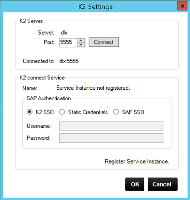 Use K2 Settings to set the K2 Server port number, register the K2 connect Server as a service instance, and specify the SAP Authentication for connecting to the SAP instance.
