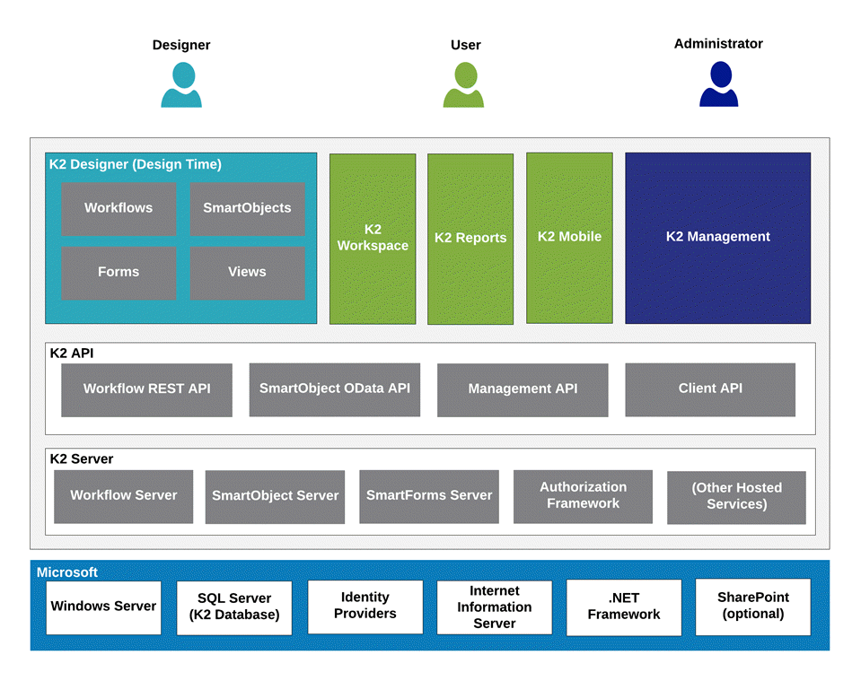 The K2 Five platform is built on Microsoft technologies such as Windows Server and the .NET Framework. The platform architecture includes modular server components, multiple APIs, and interfaces for designers (those who build forms, reports, and workflows), users (those who use K2 to action tasks, view reports, and fill out forms), and administrators (those who install and maintain the platform).