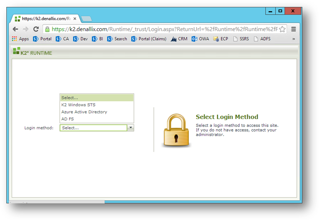 If AD FS is the only authentication configured in the Realm to Issuer mapping then you should be redirected to the AD FS log in screen. If there are other authentication modes configured then you will see a page with a drop down that lets you select the authentication method that you want to use. Authentication that you have previously been using to access your K2 smartforms sites will likely be cached by your browser. To enable you to login using AD FS you will first need to clear your browser cache.