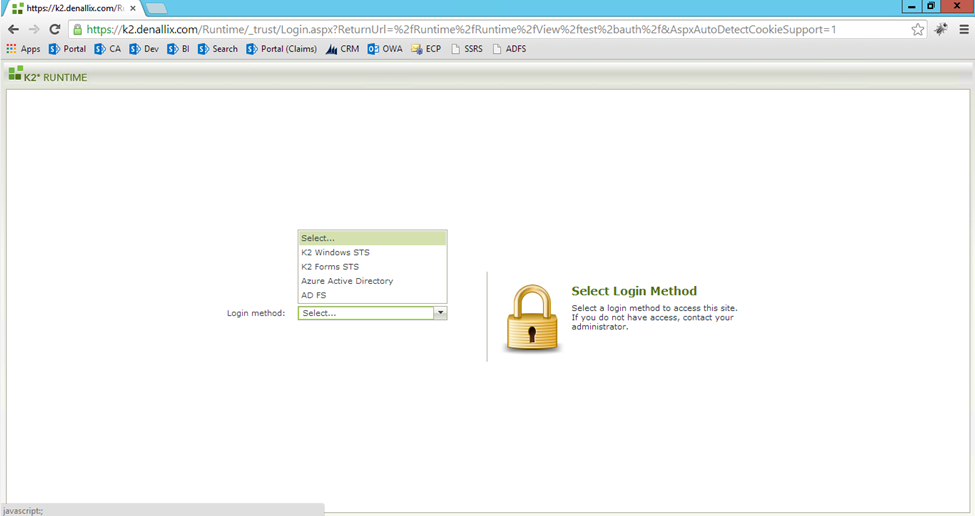 Unchecking the Use for Login option disables sites from accepting claims for the issuer. You should always have at least one issuer for logging in. If you have more than one, you see a login page as shown below when browsing to a K2 site, allowing you to choose which issuer to use before entering your credentials. This is useful when you have multiple identity providers, such as AD and SQLUM, configured in your environment, and you need to allow users from different providers to log in to the same site.