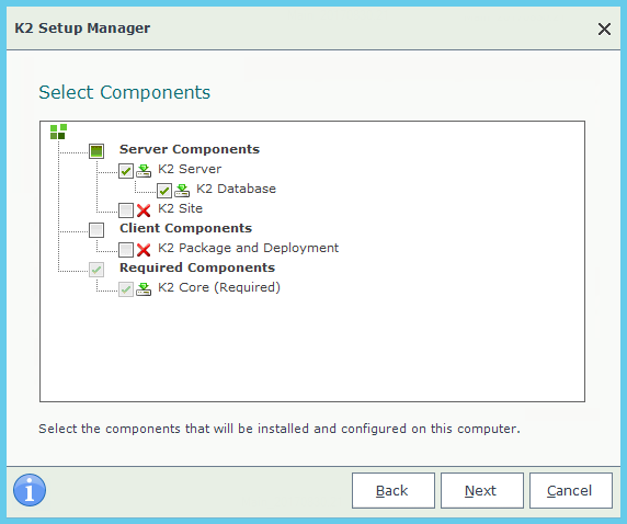 - Select only the components you want to install. In the image above, the K2 Server/K2 Database are the only server component that is selected for install. The K2 Server and K2 Database cannot be installed separately.