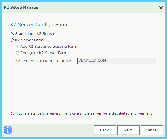 - If you are installing a subsequent "node" for an existing K2 Server farm, select K2 Server Farm and Add K2 Server to existing Farm