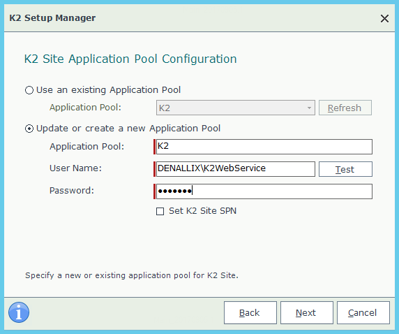 - Enable or disable the Option to set the K2 Site Machine SPN.