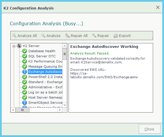 The K2 Configuration Analysis Tool is a system analysis tool that will be available after installation of K2. The tool's primary role is to provide visual feedback on the installation status of K2 components, and where errors or warnings are identified, either allow you to repair the associated issue quickly, directly from the configuration analysis tool, or provide a starting point to further troubleshooting.