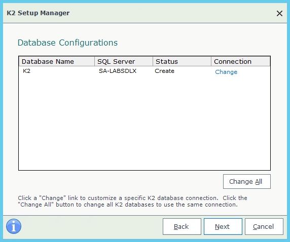 The Database Configurations page lists the K2 Database. At this point, if the database has not been created yet by the Setup manager, the Status column will show 'Create'. The connection details can be changed by clicking on the Change link in the connection column (which also allows you to rename the database).