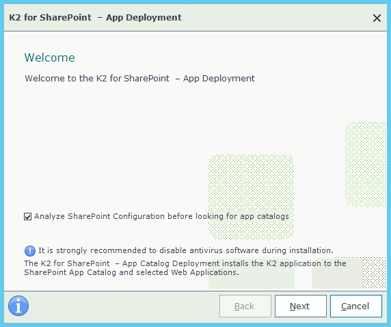 The Welcome page is the first to display once you have finished the K2 installation and where you selected the K2 App Deployment Wizard. You can also run the App Deployment Wizard by running the AppDeployment.exe file in the setup folder.