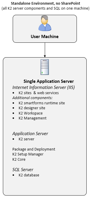 The Standalone deployment scenario is best suited for low-load environments such as a development or proof of concept environment. Since you install all components on the same physical server as the K2 Server, there are no credentials that need to be passed between servers.