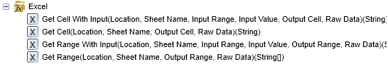Returns the cell value or range value from an Excel Workbook as a string. Can be a cell or a range. This function only works with String[] arrays. If required to set or return a single cell using the GetRange/GetRangeWithInput functions, the single value can be wrapped in a Split function to get it into the String[] array which is required by the function. Additionally, if there is a delimited list of strings to be passed in, the Split function can be used to get the delimited list into an array. Important: the dimensions of the Input Range and Input Value parameters must be the same in order to ensure data integrity. |