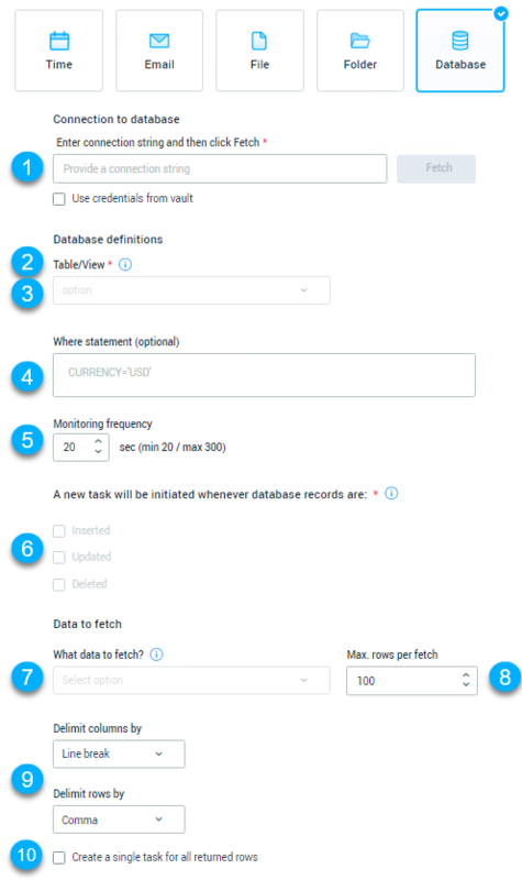 NOTE: To use the "Delete" monitor, the table must support logical delete. See About using the "Delete" monitoring option in Database Trigger.