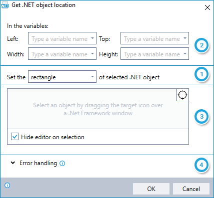 Retrieve the location (in pixels) of an object in the active .NET Framework window and place it into new or existing variables. Choose to retrieve the location represented either by: