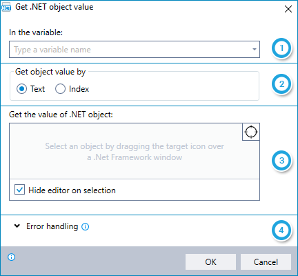 Retrieve the value of an object in the active .NET Framework window and place it into a new or existing variable. This command can be especially useful for checking the value of checkboxes, radio buttons, drop-down lists, etc.