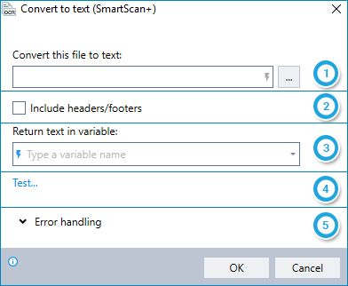 Convert an image or PDF file to text using the ABBYY recognition engine (OCR) and place the text into a new or existing variable.