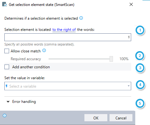 Determine whether a check box, radio button, or similar selector in a scanned document is selected (checked) by searching for it next to a specified word (the "label word").