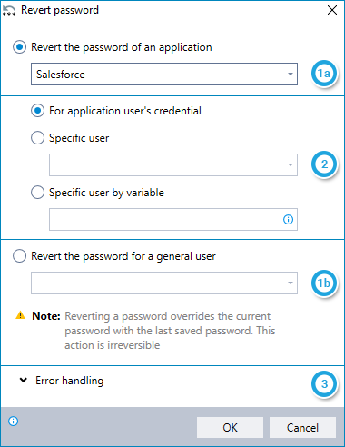 Overwrite the current password in the Credentials Vault with the last saved password, either for a specified application or for a general user (email servers, database, etc.)