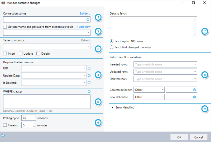 Monitor a specified database table for changes (insertions, updates, deletions) and place changed data in variables.