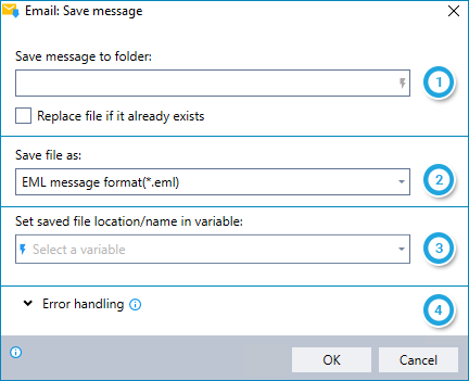 Save a message retrieved via the Get Email Messages command and place the saved path/filename into a new or existing variable.