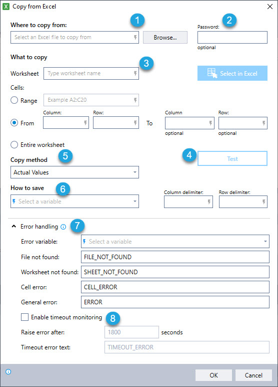Entire worksheet – The robot will copy data from the whole worksheet until it detects it has reached the last row and column in the sheet (by reading 20 consecutive empty rows/columns).