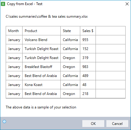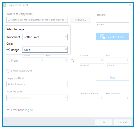 The main Copy from Excel window will appear, with the Worksheet and Range fields populated by your selections.