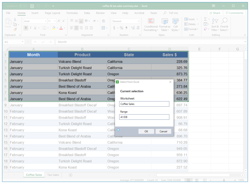 The worksheet name and cell range you have selected will appear in the selector window's Current selection fields
