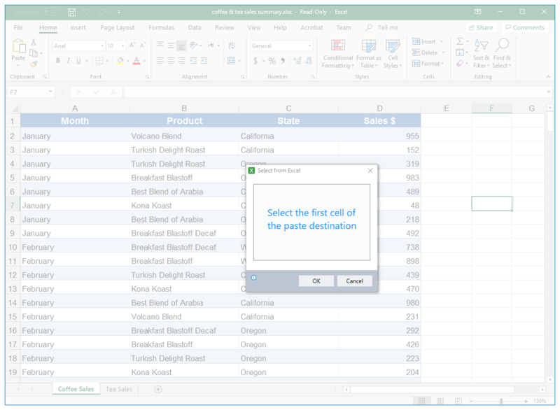 The main Paste to Excel window will appear, with the relevant fields populated by your selections.
