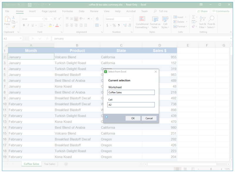 The worksheet name and cell you have selected will appear in the selector window's Current selection fields.