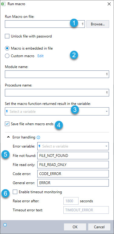 Run a VBA macro on the specified Excel file. The macro can be stored either in the Excel file itself or written directly into the Advanced Command dialog.