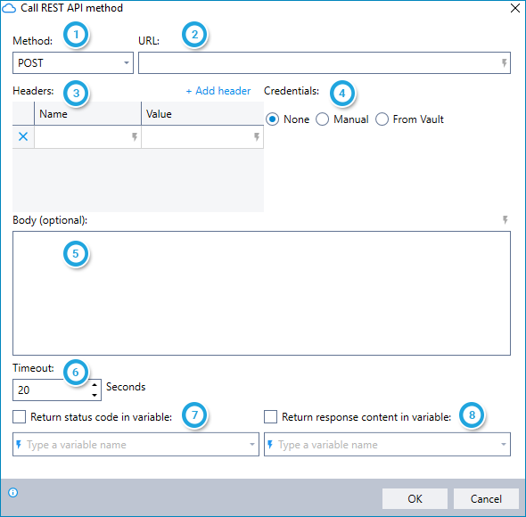 Choose whether to return response content received from the API server in a variable; and Enter the name of the variable in which to return it.
