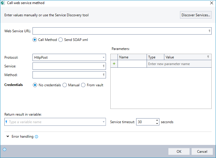 You can enter values manually (go to Step 2), or use a Discovery Service tool to configure the web service to call. The tool helps determine which host to talk to for a particular service. To activate the Service Discovery Tool, click Discover Service.