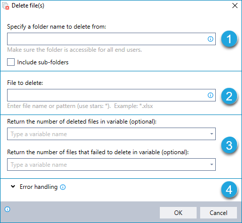 Delete one or more existing files from a specified folder, with the option to include subfolders. Deleting more than one file requires that the files are named according to a pattern that can be represented using asterisks (*) as wildcards.