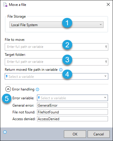 Return moved file path in variable: (optional): enter a new file path (move to target folder file) to store a new full path of the moved file in a variable for further usage.