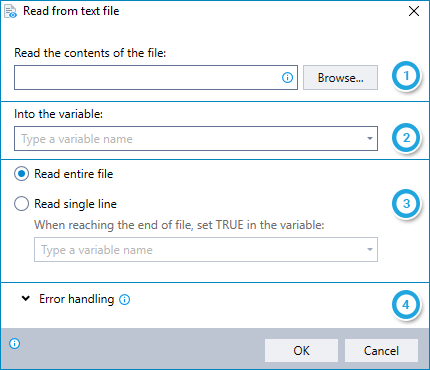 Choose whether to read the full contents of the file into the variable or a single line at a time.
