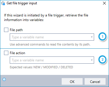 Indicate if you wish to retrieve the action executed on the file that triggered the wizard and enter the name of the variable into which to place it. The possible statuses to be returned are NEW, MODIFIED, and DELETED.