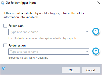 Indicate if you wish to retrieve the action executed on the folder that triggered the wizard and enter the name of the variable into which to place it. The possible statuses to be returned are NEW and DELETED.