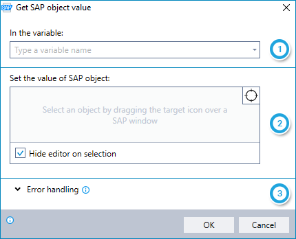 Retrieve the value of an object in the active SAP window and place it into a new or existing variable. This command can be especially useful for checking the value of checkboxes, radio buttons, drop-down lists, etc.