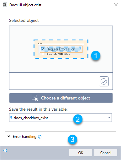 Check to see if an object exists in the currently active UI and place the result of the check (TRUE/FALSE) into a variable.