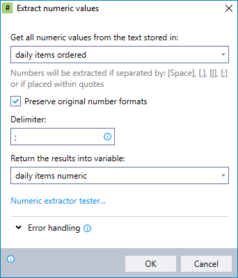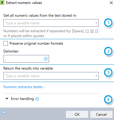 Try it out: To ensure that numbers will be extracted as you expect, try some test data. Simply click the NUMERIC EXTRACTOR TESTER link from within the EXTRACT NUMERIC VALUES command.