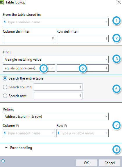 Select whether to search for the lookup value in the entire table, in a specific column, or in a specific row; and