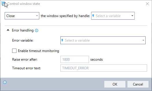 Select the action you want to take on the relevant window (close, minimize, maximize, bring to front, etc.), and enter the name of the variable in which the handle of the window is stored.