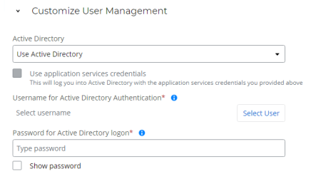 (Optional) If you select Use application services credentials, this option will log you into the Active Directory using the application service credentials you configured in the Customize Application Services User section. You will need to configure your authentication further: