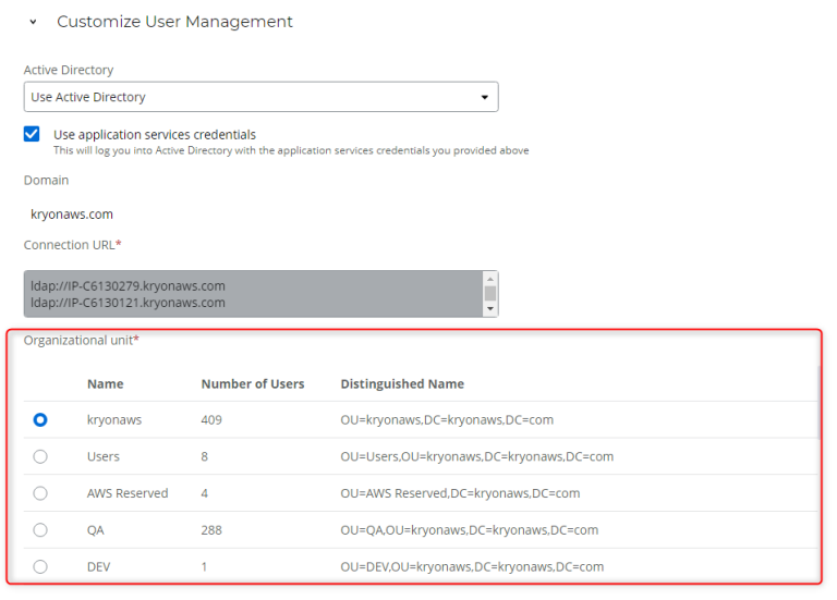 Select one organizational unit from the list, which is automatically populated with the available units in that domain (this can take some time).