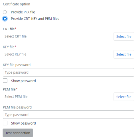 If you selected With SSL/TLS, you must provide either a PFX file or CRT, KEY, and PEM files: