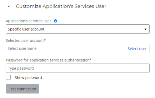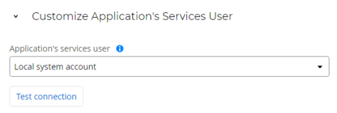 Select the user account that you want to use for running Nintex RPA and related services on your server. If you have unique security requirements or restrictions to customizing service access, choose Specific user account. With both options, you can click Test connection to ensure that you can successfully connect using the selected Application's services user.