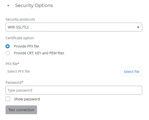 Test connection: Validate the SSL/TLS connection using the PFX file.
