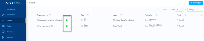For each trigger, the Status column displays one of three possible trigger statuses: